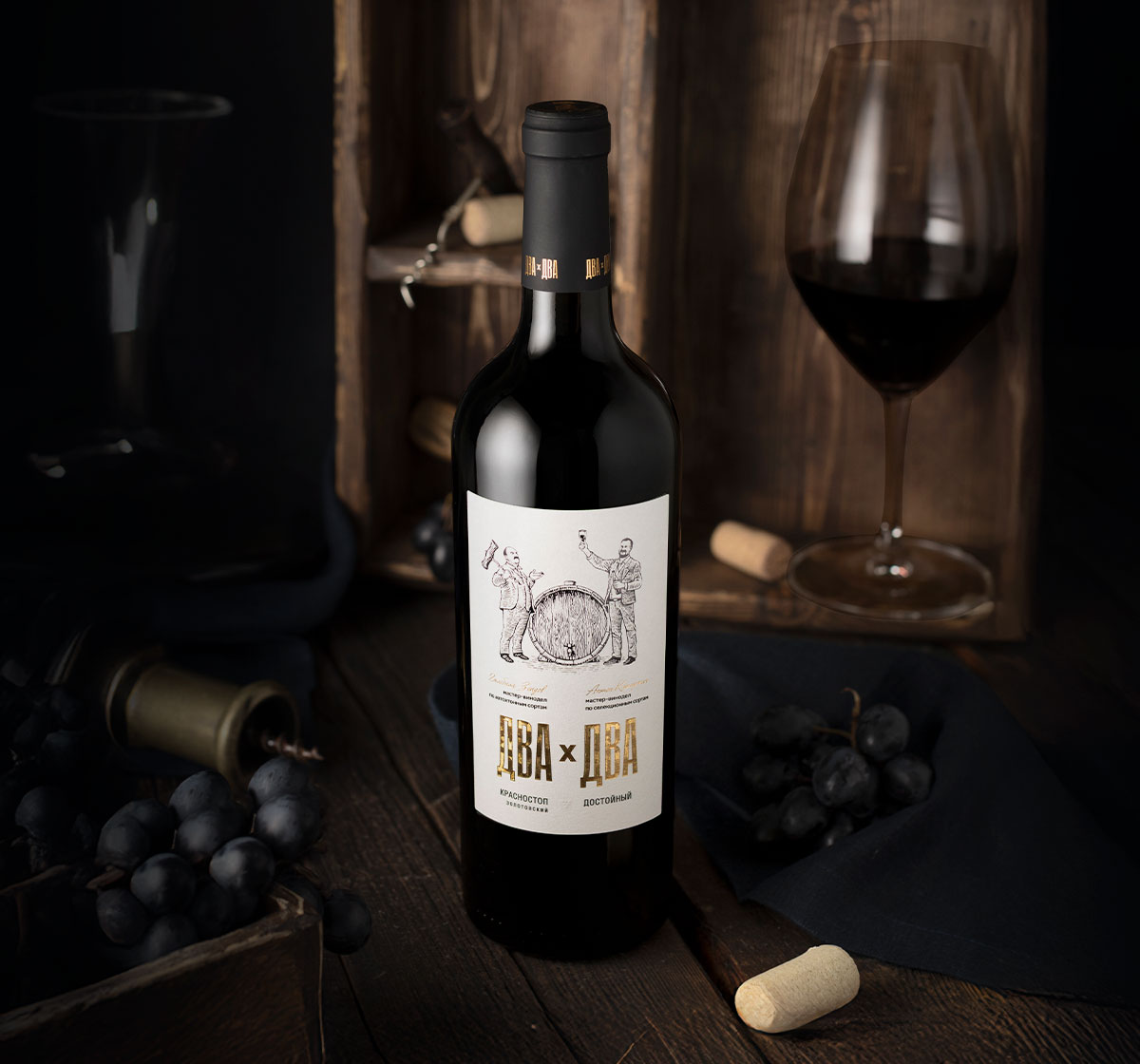 История сотрудничества двух виноделов отображается в дизайне первого винтажа «Два x Два»: его этикетку украшают фигуры виноделов с ярким брендингом. Проект стал посвящением всем российским виноделам, открывающим в своей работе новые профессиональные горизонты.