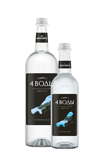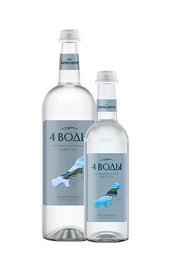 «4 воды» - природная питьевая вода от «Абрау-Дюрсо». По легенде именно из четырех источников берет свое начало горное озеро Абрау.